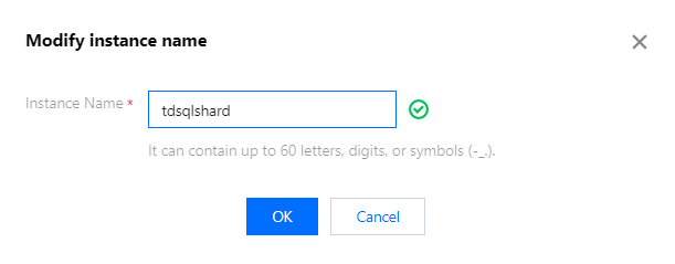 1. Log in to the TDSQL console, locate an instance in the instance list, and click the icon next to its name. You can also click an instance name/ID in the instance list to access the instance details page, and click the icon next to the instance name in the Basic Info section. 2. In the pop-up window, modify the instance name and click OK.