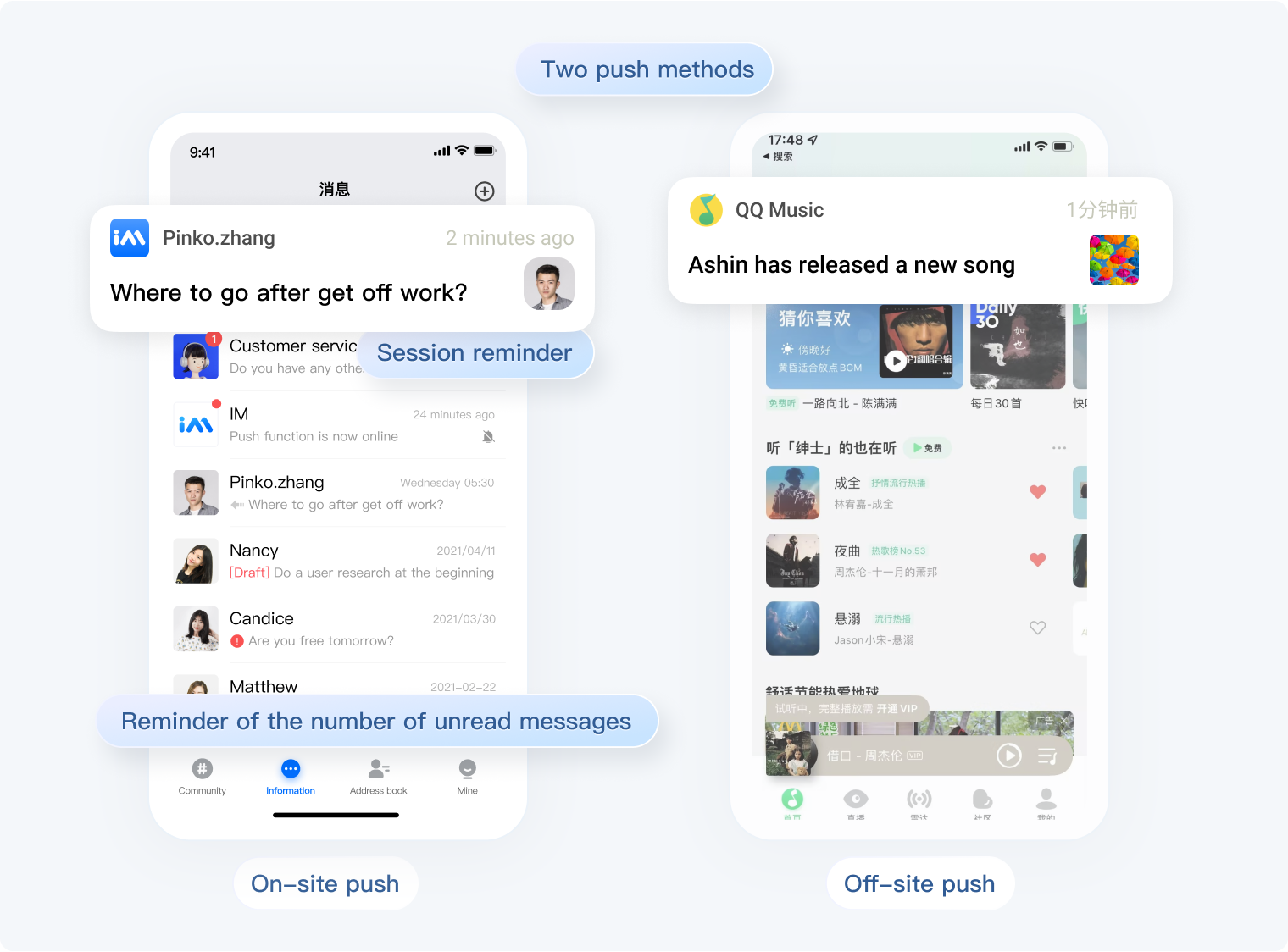 V2TIMOfflinePushInfo v2TIMOfflinePushInfo = new V2TIMOfflinePushInfo();v2TIMOfflinePushInfo.setTitle("Push Title");v2TIMOfflinePushInfo.setDesc("push content");OfflinePushExtInfo offlinePushExtInfo = new OfflinePushExtInfo();offlinePushExtInfo.getBusinessInfo().setSenderId("senderID");offlinePushExtInfo.getBusinessInfo().setSenderNickName("senderNickName");if (chatInfo.getType() == V2TIMConversation.V2TIM_GROUP) {offlinePushExtInfo.getBusinessInfo().setChatType(V2TIMConversation.V2TIM_GROUP);offlinePushExtInfo.getBusinessInfo().setSenderId("groupID");}// Pass-through field fillv2TIMOfflinePushInfo.setExt(new Gson().toJson(offlinePushExtInfo).getBytes());final V2TIMMessage v2TIMMessage = message.getTimMessage();String msgID = V2TIMManager.getMessageManager().sendMessage(v2TIMMessage, isGroup ? null : userID, isGroup ? groupID : null,V2TIMMessage.V2TIM_PRIORITY_DEFAULT, false, v2TIMOfflinePushInfo, new V2TIMSendCallback<V2TIMMessage>() {@Overridepublic void onProgress(int progress) {}@Overridepublic void onError(int code, String desc) {TUIChatUtils.callbackOnError(callBack, TAG, code, desc);}@Overridepublic void onSuccess(V2TIMMessage v2TIMMessage) {TUIChatLog.v(TAG, "sendMessage onSuccess:" + v2TIMMessage.getMsgID());message.setMsgTime(v2TIMMessage.getTimestamp());TUIChatUtils.callbackOnSuccess(callBack, message);}});