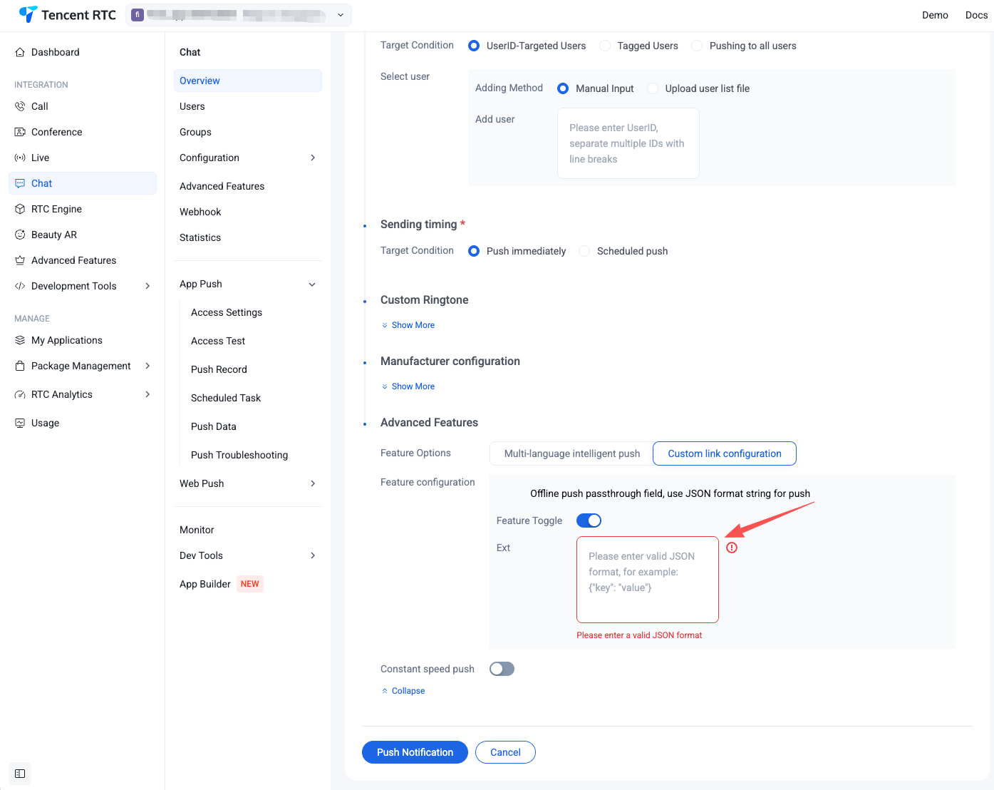 TIMPushListener timPushListener = TIMPushListener(onNotificationClicked: (String ext) {debugPrint("ext: $ext");// Getting ext for Definition redirect});tencentCloudChatPush.addPushListener(listener: timPushListener);
