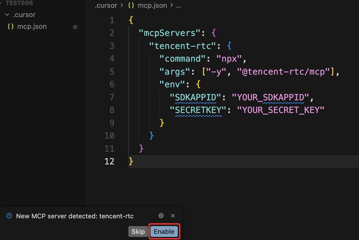 3. Create or update .cursor/mcp.json with the following, and fill in your SDKAPPID and SECRETKEY: