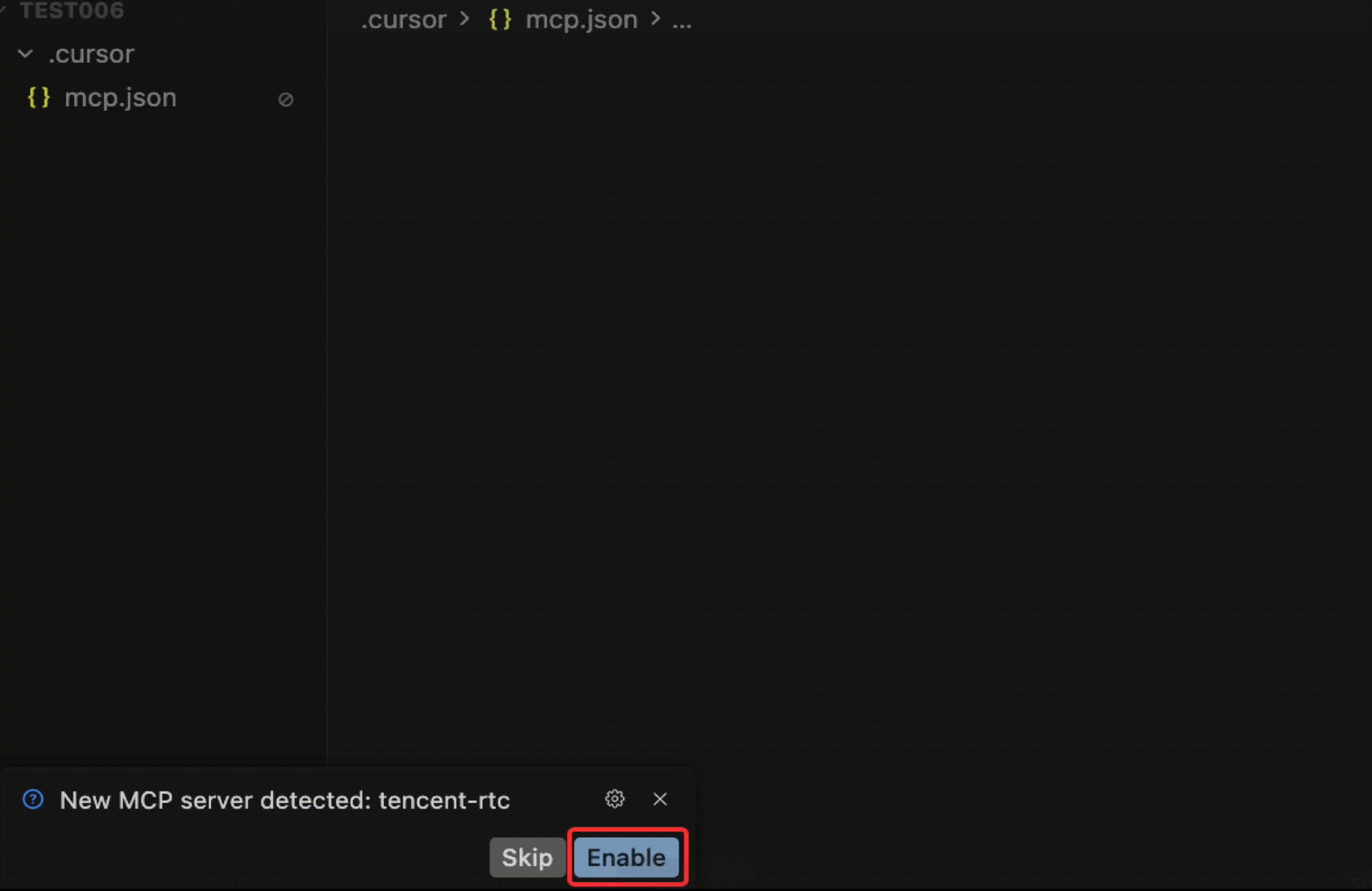 4. Save your changes. When prompted by Cursor that "New MCP server detected", click Enable.