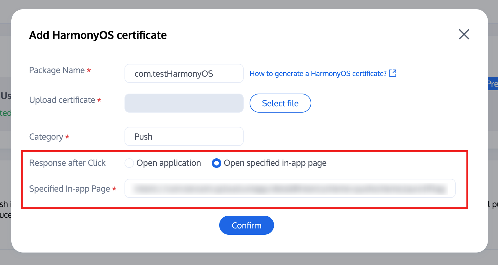 Register the callback timing in the oncreate() function of the application UIAbility. Console configuration click subsequent actions with the following configuration, select open specified in-app page, do not modify use default values.