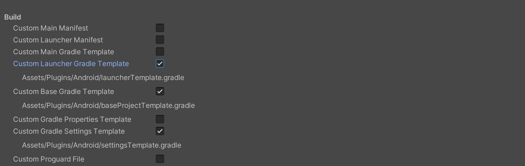 File > Build Settings > Player Settings, then go to Publishing Settings > Build in the Android platform settings and check the following three configurations: