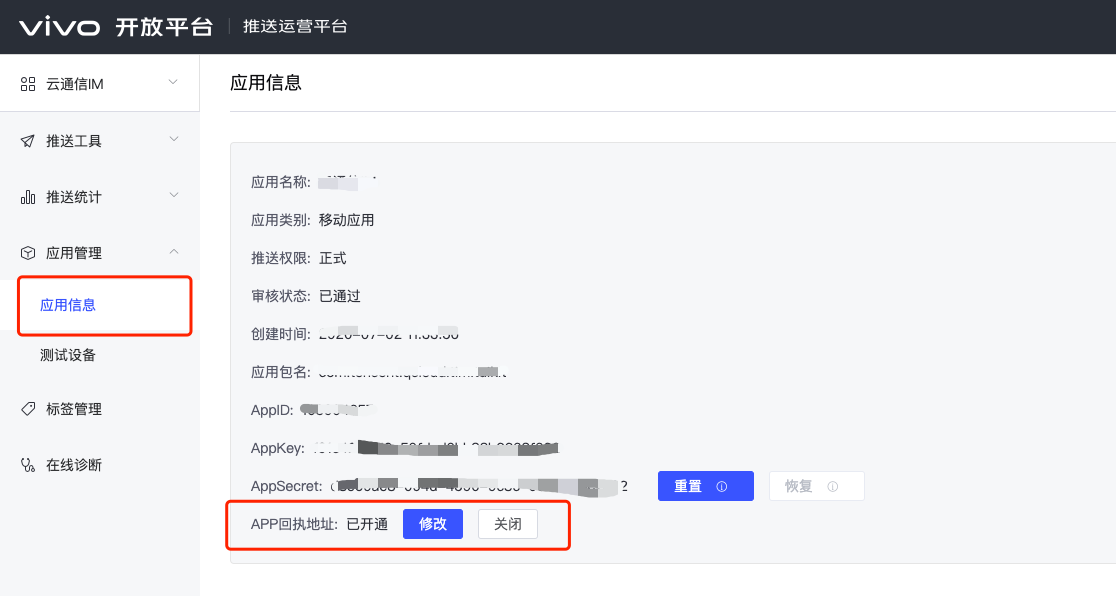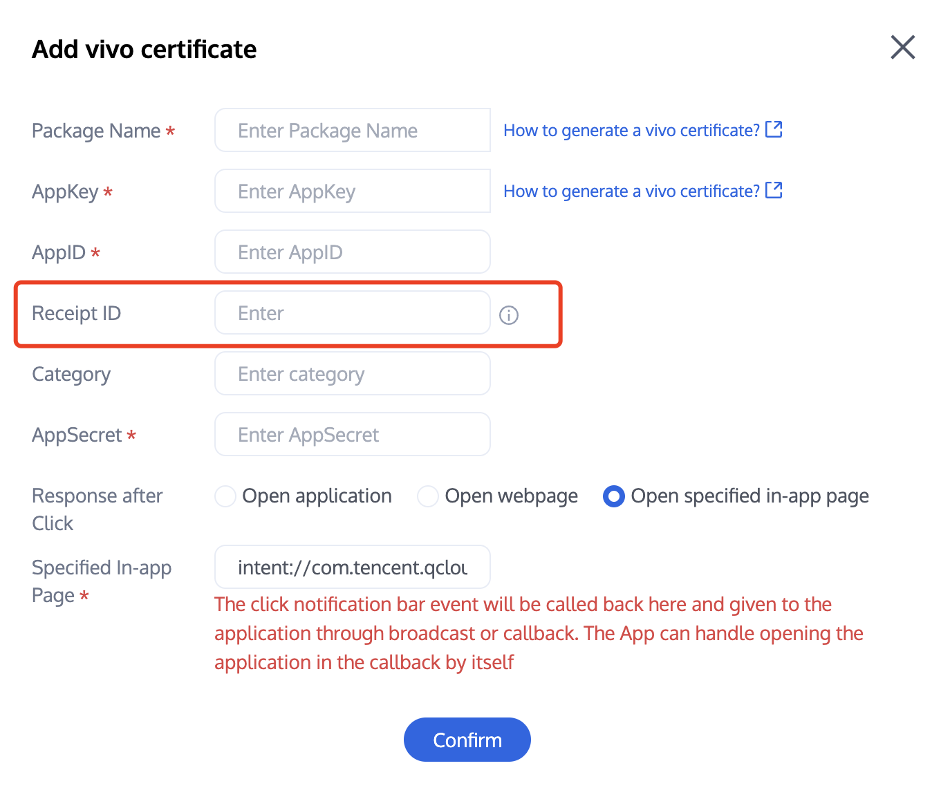 ![]() Receipt Address: Singapore :https://apisgp.im.qcloud.com/v3/offline_push_report/vivo Korea: https://apikr.im.qcloud.com/v3/offline_push_report/vivo USA: https://apiusa.im.qcloud.com/v3/offline_push_report/vivo Germany: https://apiger.im.qcloud.com/v3/offline_push_report/vivo Indonesia: https://apiidn.im.qcloud.com/v3/offline_push_report/vivo China: https://api.im.qcloud.com/v3/offline_push_report/vivo | ![]() |
