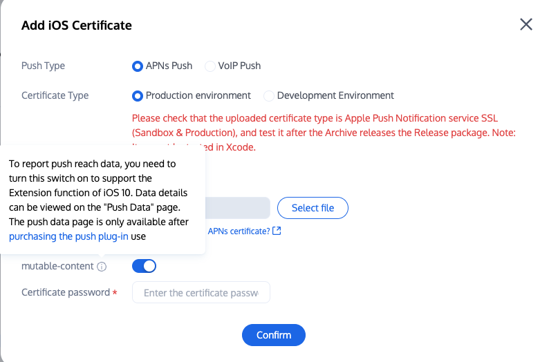 UnityIMPush.mm under the directory Assets/Plugins/iOS (if the directory does not exist, create it manually), and implement the - businessID protocol method in the file to return the certificate ID. See the implementation as follows:#import "TPush/TPush.h"#import "UnityAppController.h"@interface UnityAppController (ThirdPartyExtension) <TIMPushDelegate>- (int)businessID;- (NSString *)applicationGroupID;@end@implementation UnityAppController (ThirdPartyExtension)#pragma mark - TIMPush- (int)businessID {//Certificate ID from the previous step console, such as 1234567int kBusinessID = 1234567;return kBusinessID;}- (NSString *)applicationGroupID {//AppGroup IDreturn kTIMPushAppGroupKey;}- (BOOL)onRemoteNotificationReceived:(NSString *)notice {// custom navigatereturn NO;}@end