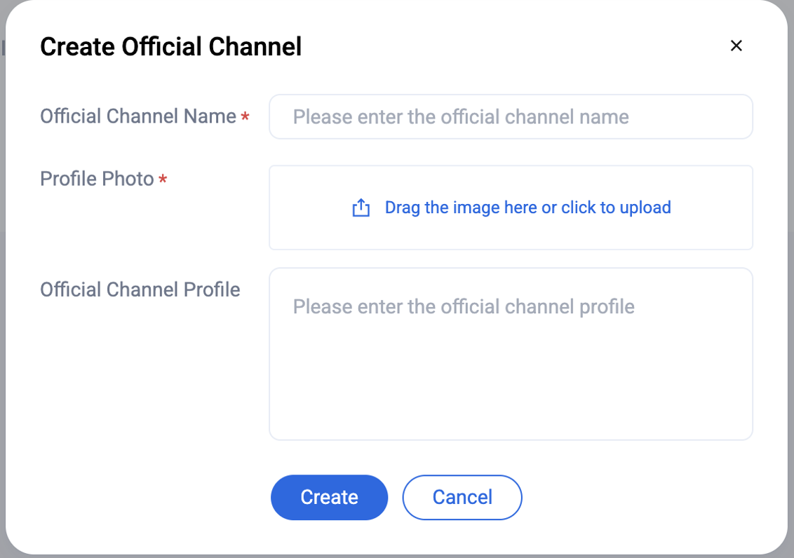 Official Channel Name: Enter a name for the official channel. This parameter is required and must not exceed 150 bytes.