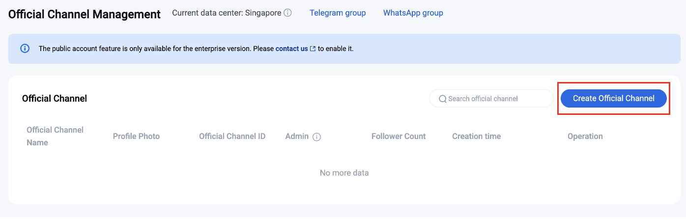1. On the Official Channel Management page, click Create Official Channel.