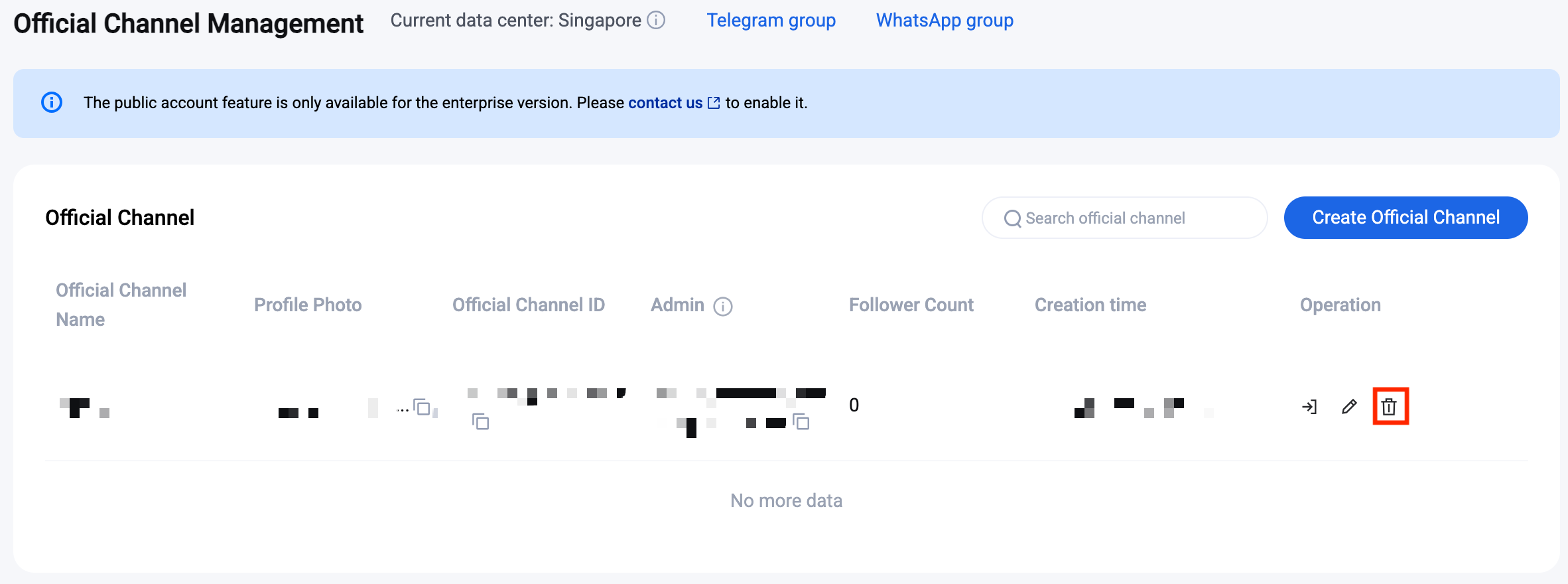1. On the Official Channel Management page, select the official channel you want to delete and click Delete button on the right.