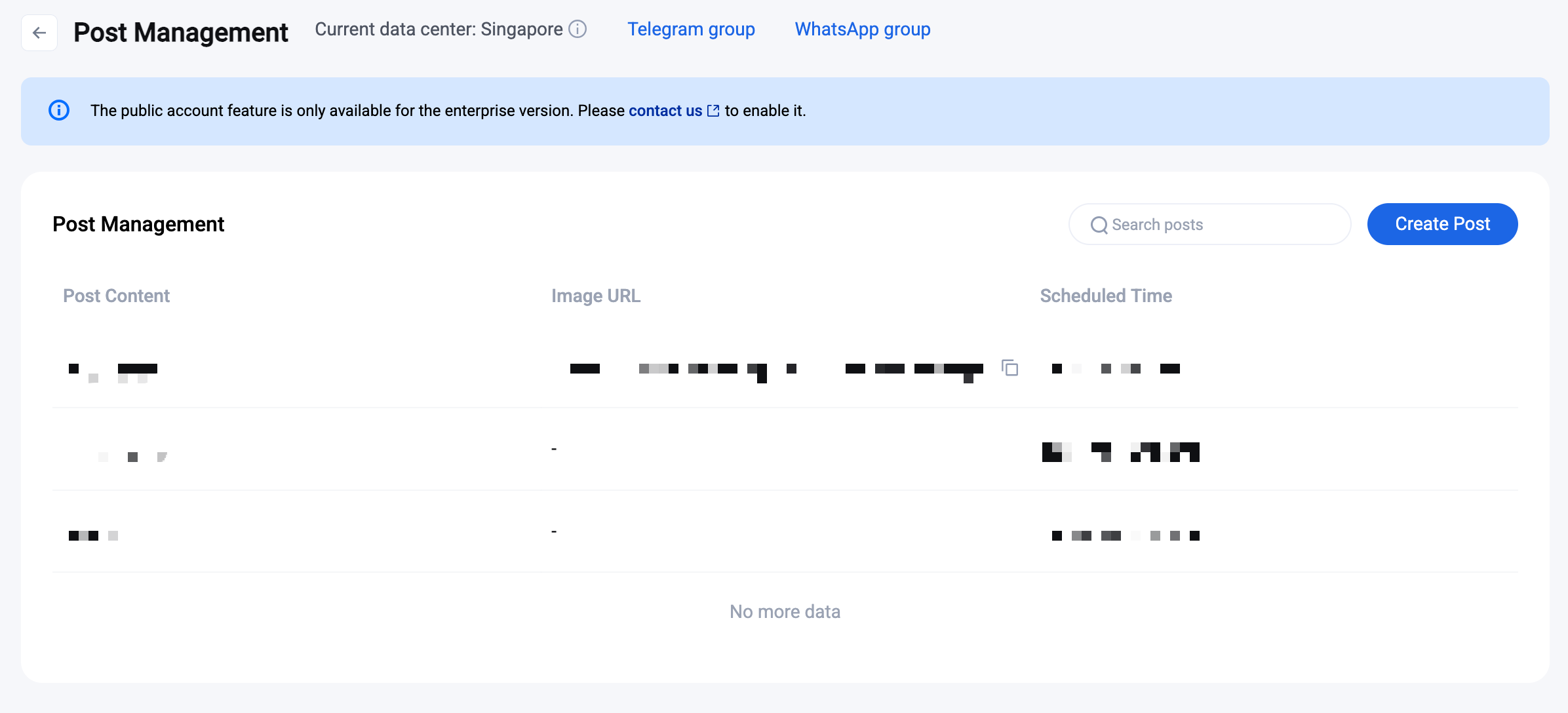 The Post Management page lets you create, view, and search all posts sent from official channels