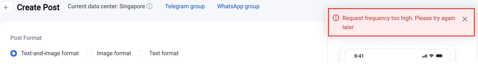 6. If the post fails to send, a popup in the upper right corner will show the error message. Update the post as needed based on the prompt.