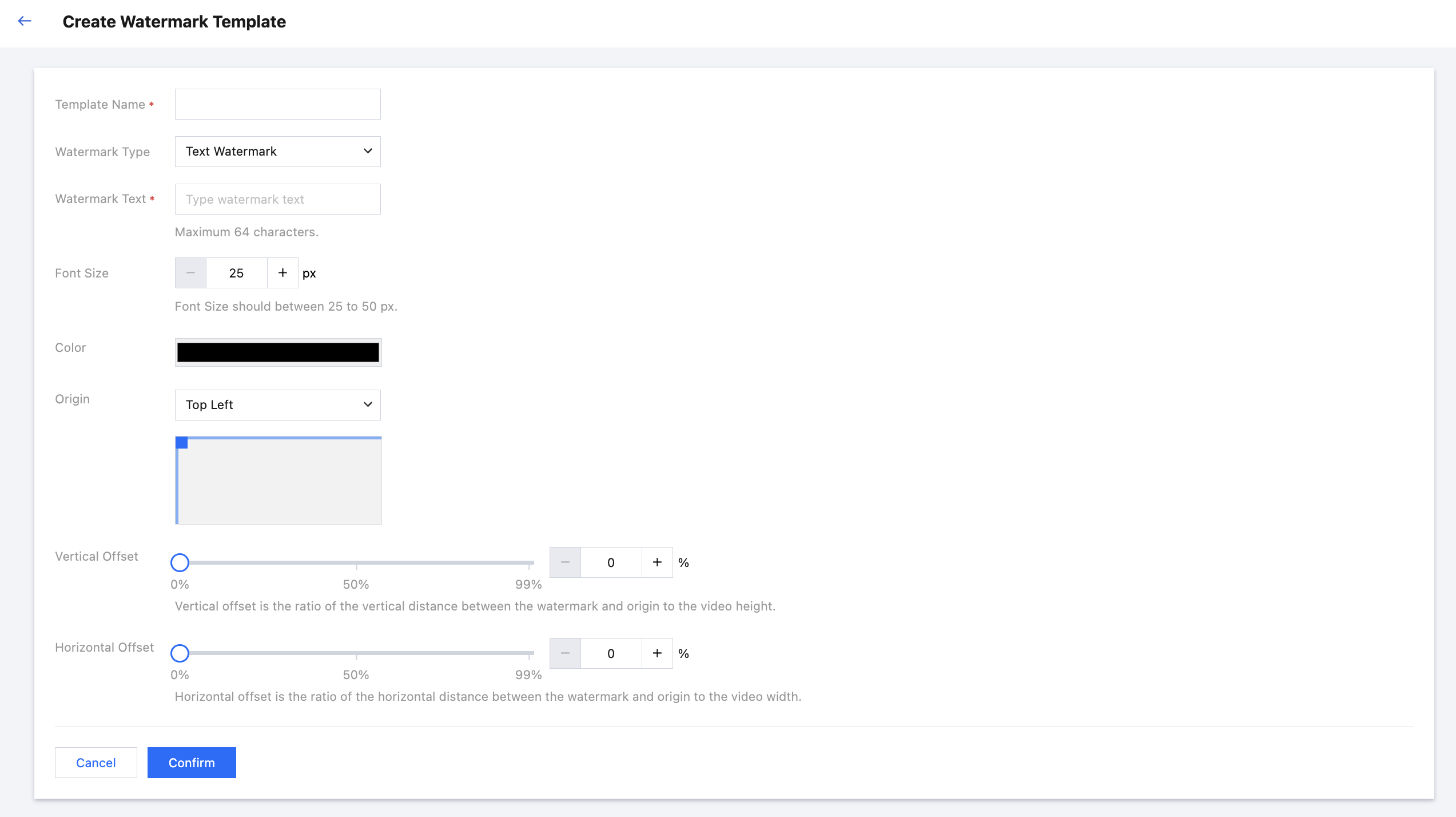 To add a watermark, on the Watermark Management page, click Create Template and complete the following settings: