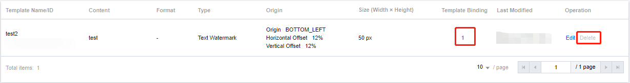 On the Watermark Management page, find the target watermark and click Delete in the Operation column to delete the watermark.