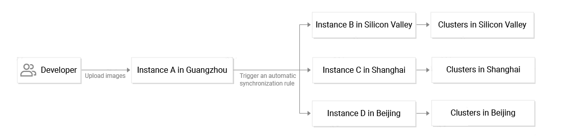 When an enterprise-class container customer expands business throughout the country or to multiple regions worldwide, the customer needs to pull images from the nearest region. This not only improves the pulling speed to ensure fast business deployment, but also enables data transmission through private networks in the same region to reduce public-network bandwidth costs.