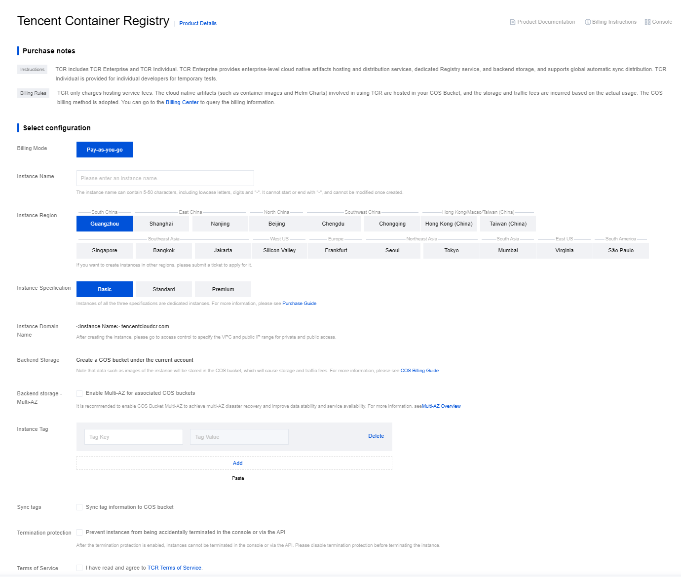 Billing Mode: TCR is billed in pay-as-you-go mode. For more information, see Billing Overview. Instance Name: Enter a custom instance name. The name must be globally unique and cannot be identical with an existing instance name of your own or another user. This name is used as the access domain name of this TCR instance. The name cannot be modified after the instance is created. We recommend that you use an abbreviation that combines the company name and instance region or project as the instance name.
