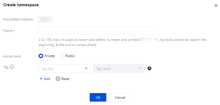 Tag: Cloud tags can be bound for the classification and management of resources from the namespace dimension. If existing tags do not meet your requirements, select Manage Tags in the console to manage tags. 4. Click OK.