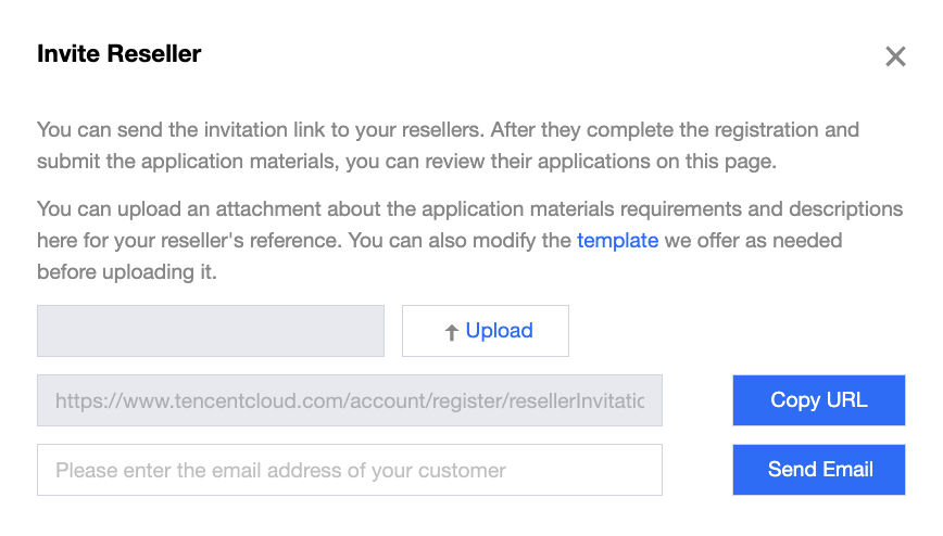 1. Log in to the Partner Center Console with a primary distributor account, and navigate to the Reseller > Reseller Management page. 2. Click Invite Reseller, copy the invitation link and direct send it or enter the email address to send the invitation link to the second-level reseller via email.