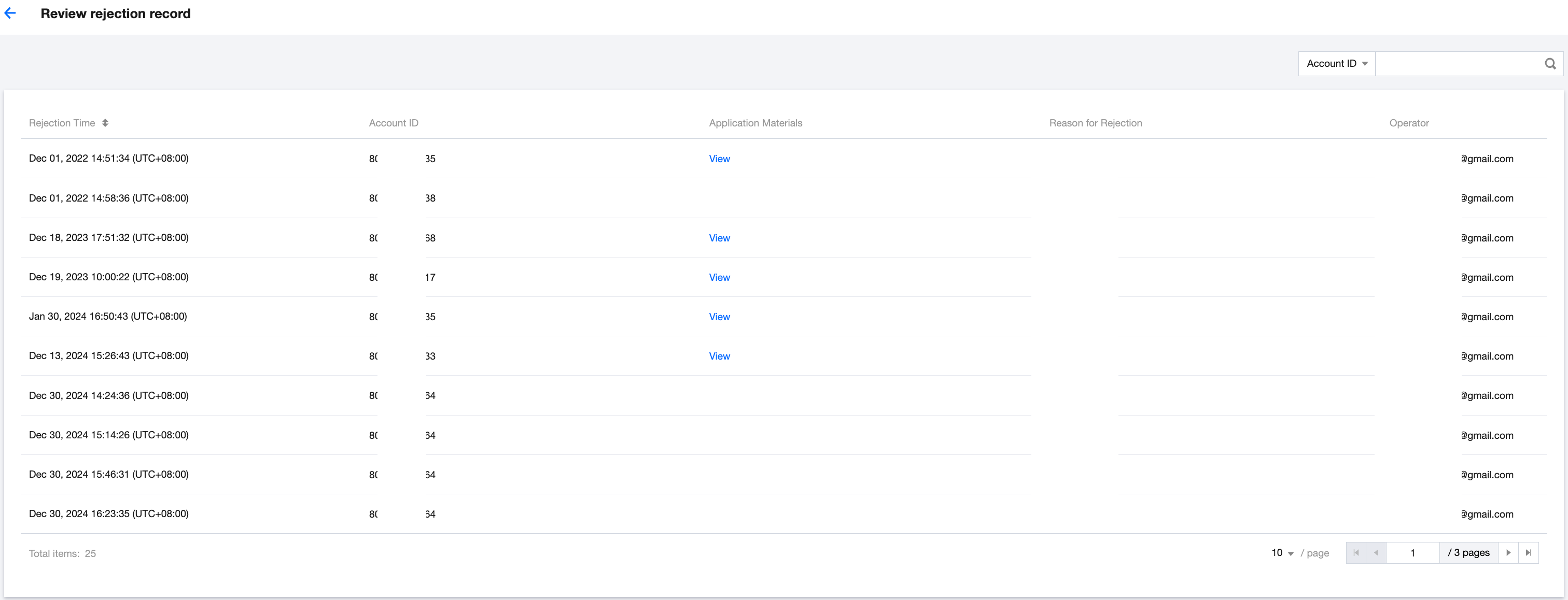 When a binding application submitted by a second-level reseller is rejected by a distributor, the distributor can click Check rejection record in the upper right corner of the Reseller Management webpage to view all rejection records.