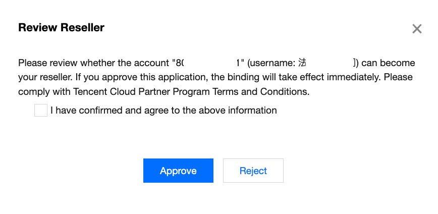 Note: Only resellers can register new Tencent Cloud accounts. When applying to bind as a second-level reseller of distributor, the reseller's existing cloud account cannot conduct resale business.