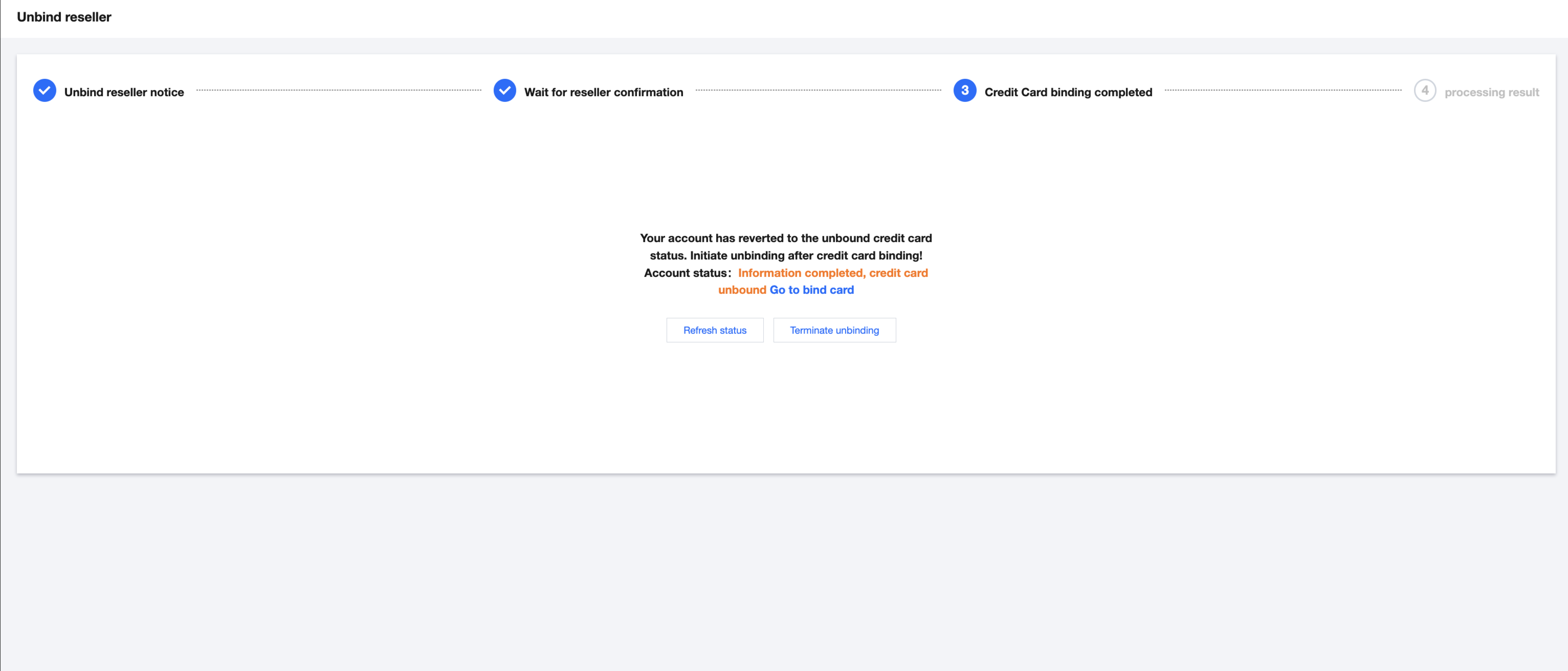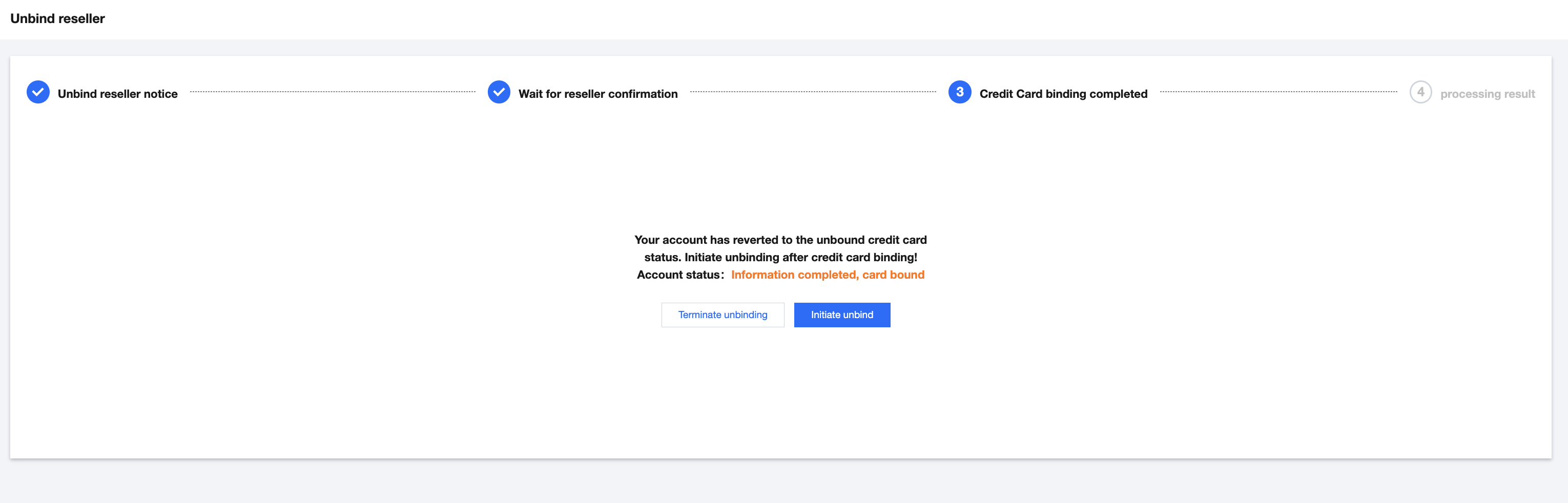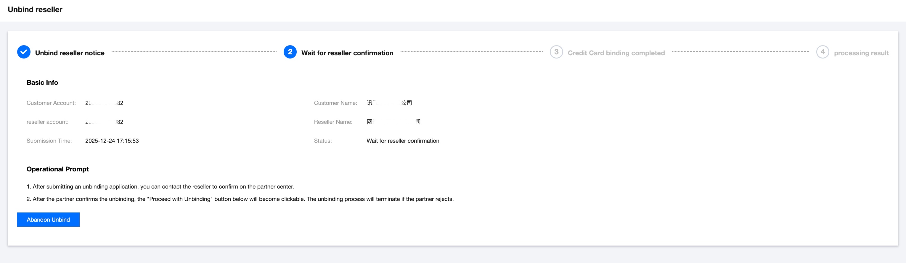 The unbind process aims to remove the distribution relationship between you and the reseller, as well as all resources under the current account. Ensure to agree upon with the reseller before initiating the request.