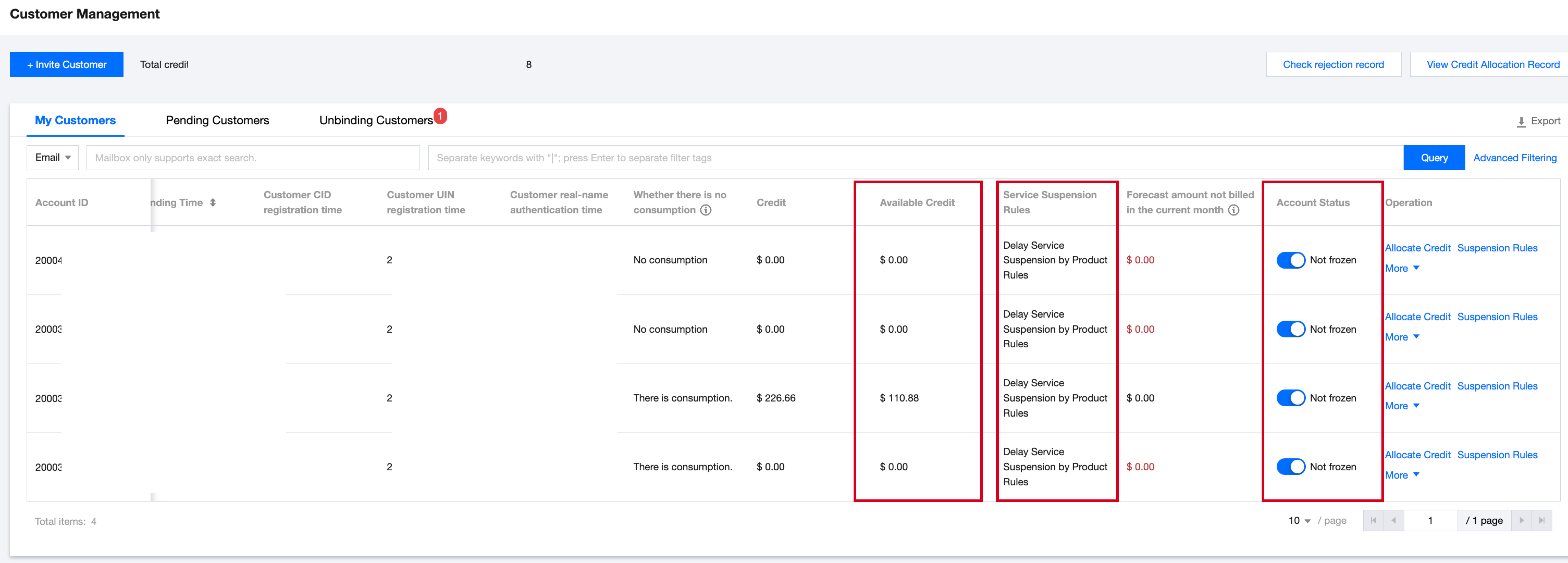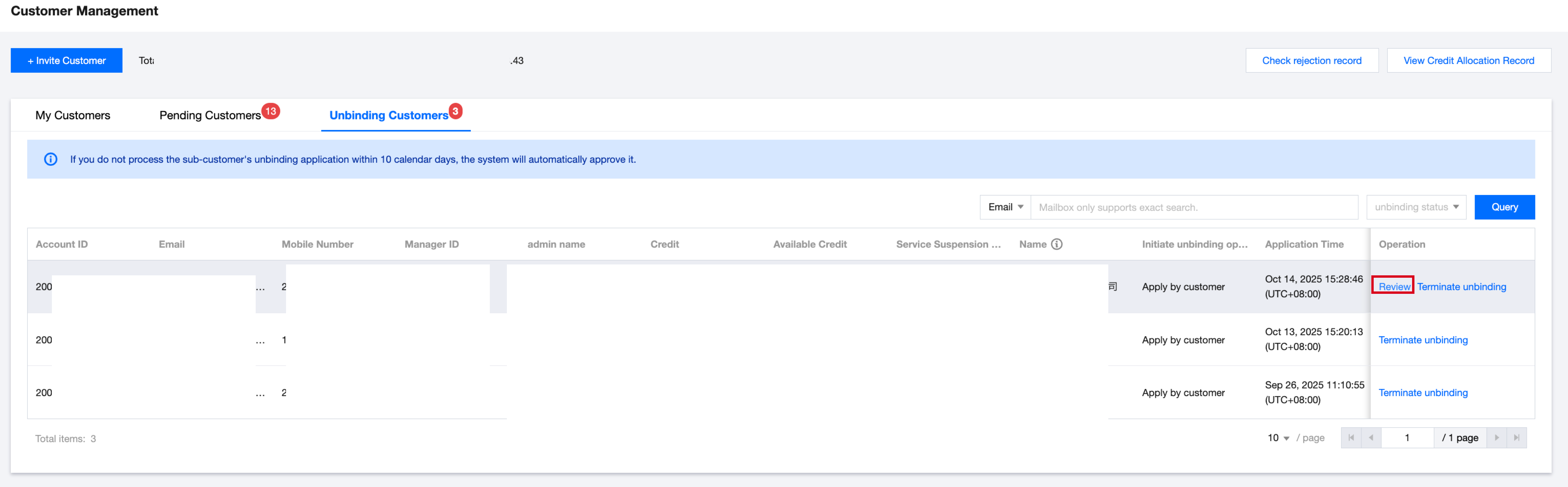 Sub-customer status is normal and not frozen. If the sub-customer is frozen, please first unfreeze it before unbinding. See Sub-account Freeze and Recovery. Sub-customer available credit is equal to or greater than 0. If the available credit is less than 0, allocate credit to the sub-customer before unbinding. See allocating credit to reseller's customer. Unbind reseller notice