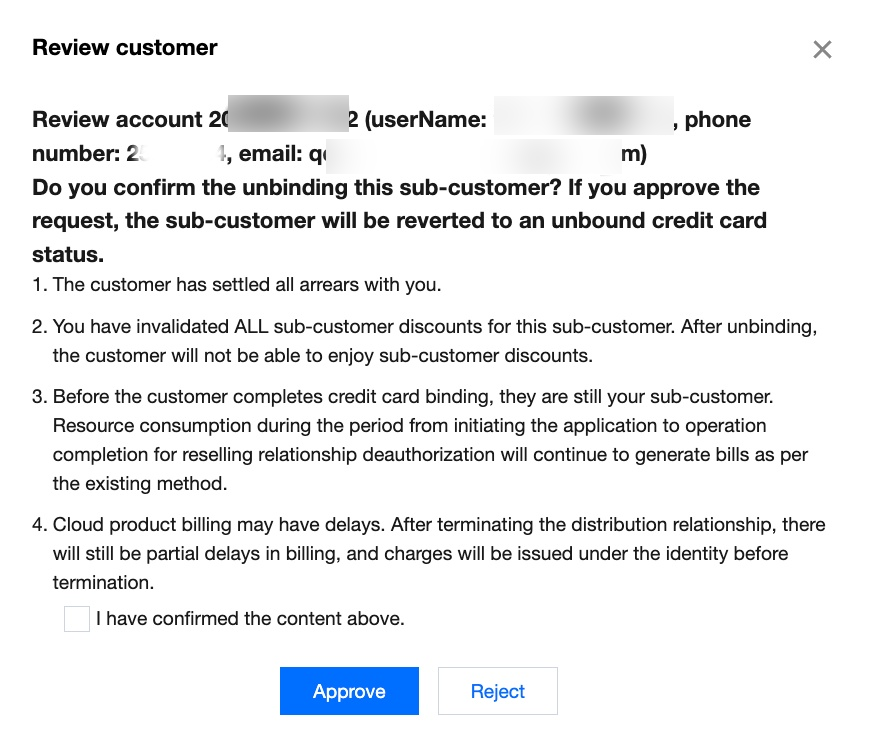 6.1 The reseller clicks Review, checks "I have confirmed the above information" in the pop-up window, and clicks Approve to approve the sub-customer unbinding application.