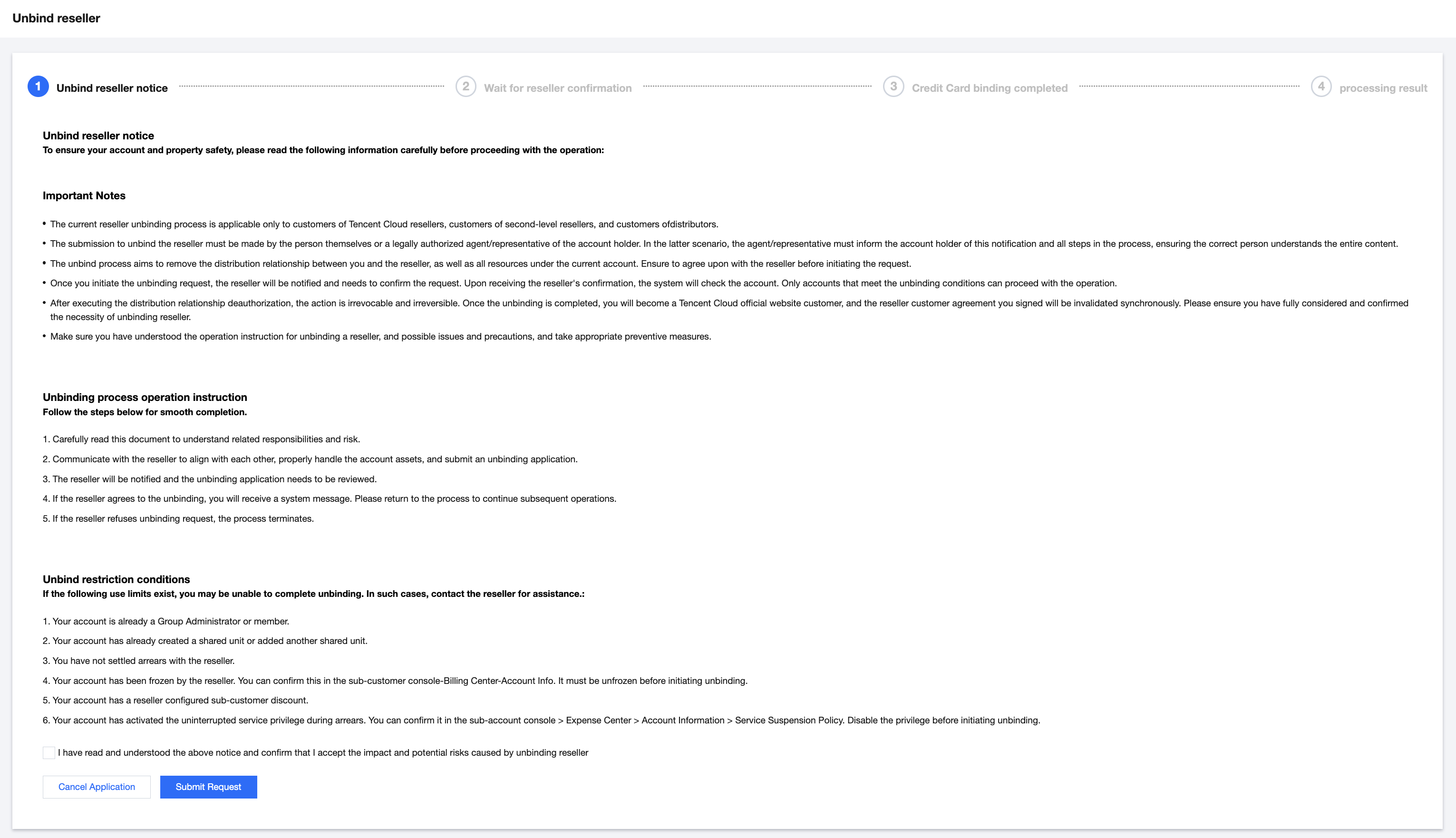 3. Read the reseller unbinding notice, check "I have read and understood the above notice and confirm that I accept the impact and potential risks caused by unbinding reseller", then click Submit Request.
