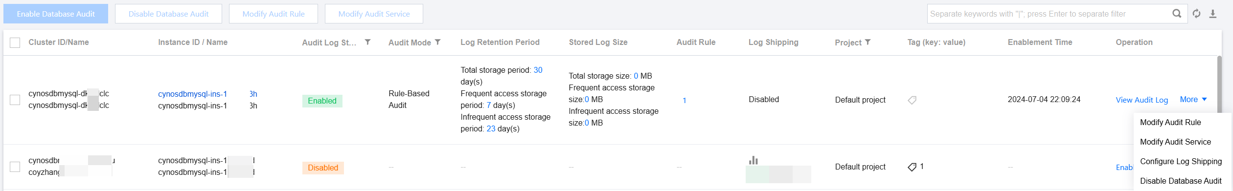 4. Find the target instances in the audit instance list, or search for them by resource attribute in the search box, and select them. Then, click Modify Audit Service above the list.