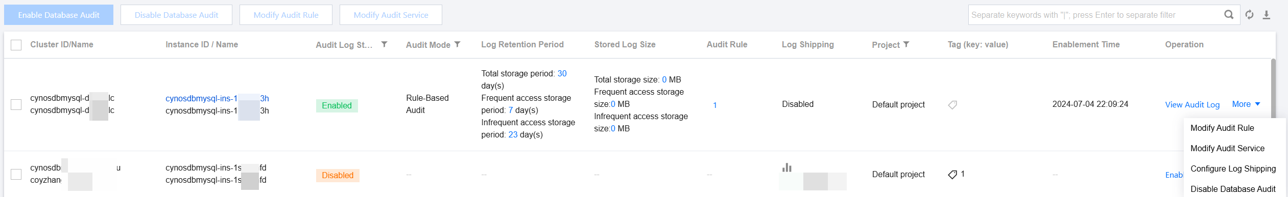 After the audit service is disabled, instances will no longer be audited, and historical audit logs will be cleared.