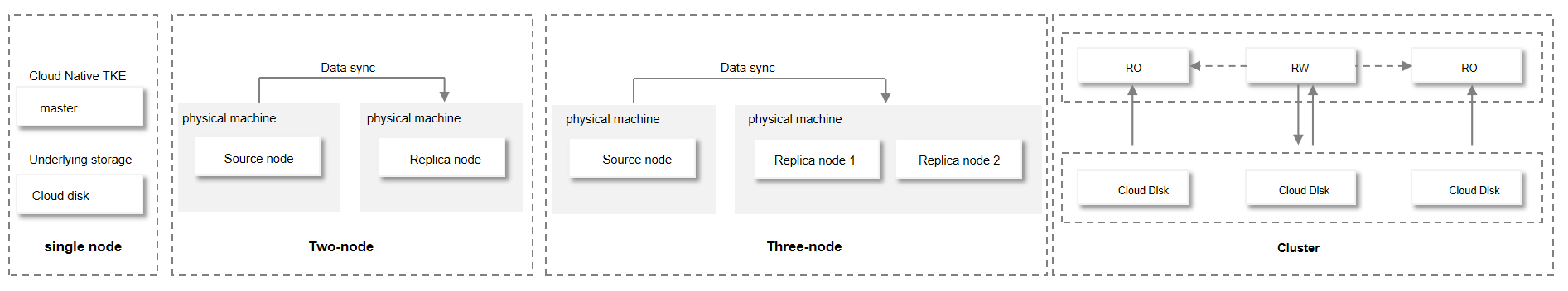Architecture | Cluster: A cluster can contain only one read-write instance and up to 15 read-only instances. | Single-node: One single node. Two-node: One source node and one replica node. Three-node: One source node and two replica nodes. |