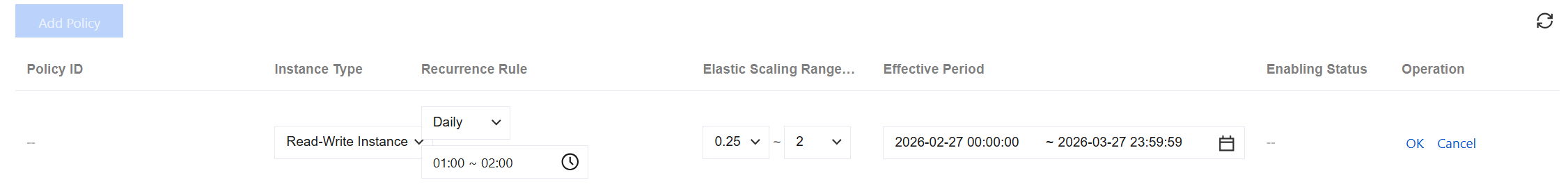 Effective Period | Please set the effective time range for this elastic policy, for example: 2026-03-01 00:00:00 ~ 2026-03-15 23:59:59. Note: Support down to the second. If you set dates only without specifying specific times, the time range will default to 00:00:00 on the start date to 23:59:59 on the end date. |