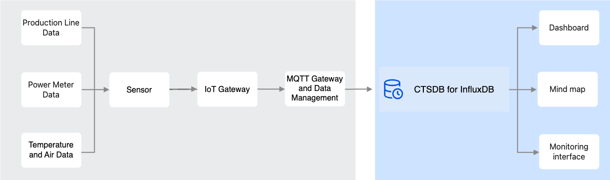In IoT/IIoT scenarios, various equipment, sensors, and environmental data are collected by sensors and transmitted in real time to the control system, facilitating real-time monitoring, fault prediction, trend forecasting, and data visualization of equipment running status, workshop environments, and production conditions for Ops personnel. These data feature large volume, excellent real-time performance, and ordered time. CTSDB 3.0 has high-throughput write performance, low-cost tiered storage, precise aggregation analysis, and rich visualization dashboard display capabilities, making it an ideal choice for IoT applications.