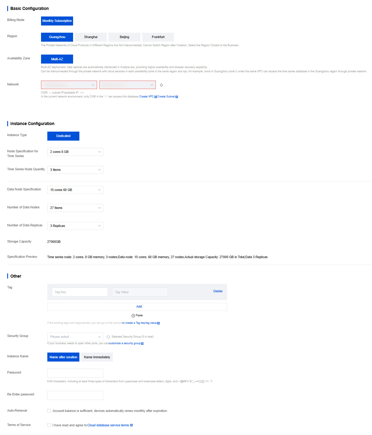| Specification Preview | Preview the configured time series node specifications and data node specifications. | - |