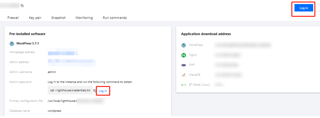 , click to copy the command for getting the WordPress admin account and password. 4. In the Pre-installed software section, click Log in.