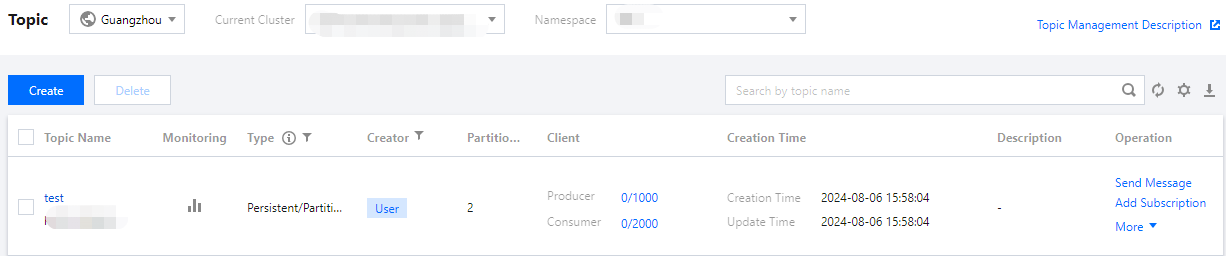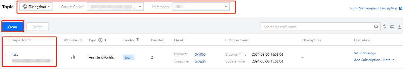 2. In the left sidebar, choose the Topic tab, and select the created cluster and namespace for the current cluster and namespace respectively.