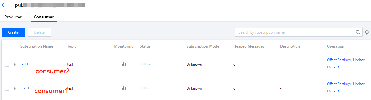 5. Choose More > View Subscriptions/Consumer in the operation column to view the created subscriptions.