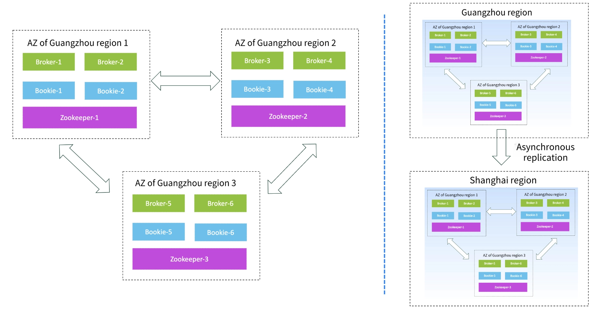 TDMQ for Apache Pulsar Pro Edition supports cross-AZ deployment. When you purchase a TDMQ for Apache Pulsar cluster in a region with 3 or more availability zones (AZs), you can select up to 3 AZs to purchase a cross-AZ instance. The partition replicas of the instance will be forcibly distributed across nodes in different AZs. This deployment mode ensures that your instance continues to normally provide services if a single AZ becomes unavailable. However, intra-city 3-AZ deployment does not meet the disaster recovery requirements of financial customers. They require cross-region disaster recovery to ensure business continuity by quickly switching business to a backup region in the event of a region-level disaster.