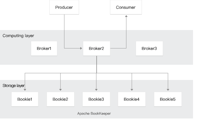 Apache Pulsar adopts the compute-storage separation model in architectural design. The computing logic related to message publishing and subscription is completed in the broker, and the data is stored on the bookie nodes in the Apache BookKeeper cluster.