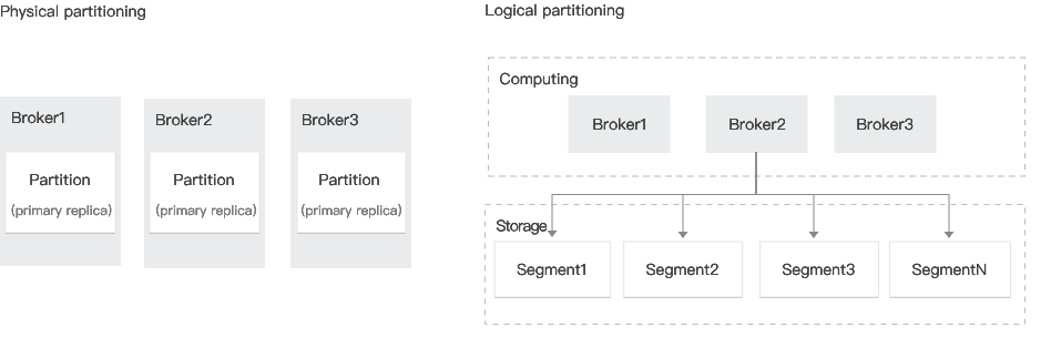 Logical partitions: Logical partitions are physical shards, and the computing layer and the storage layer are isolated. This structure gives Apache Pulsar the following advantages: