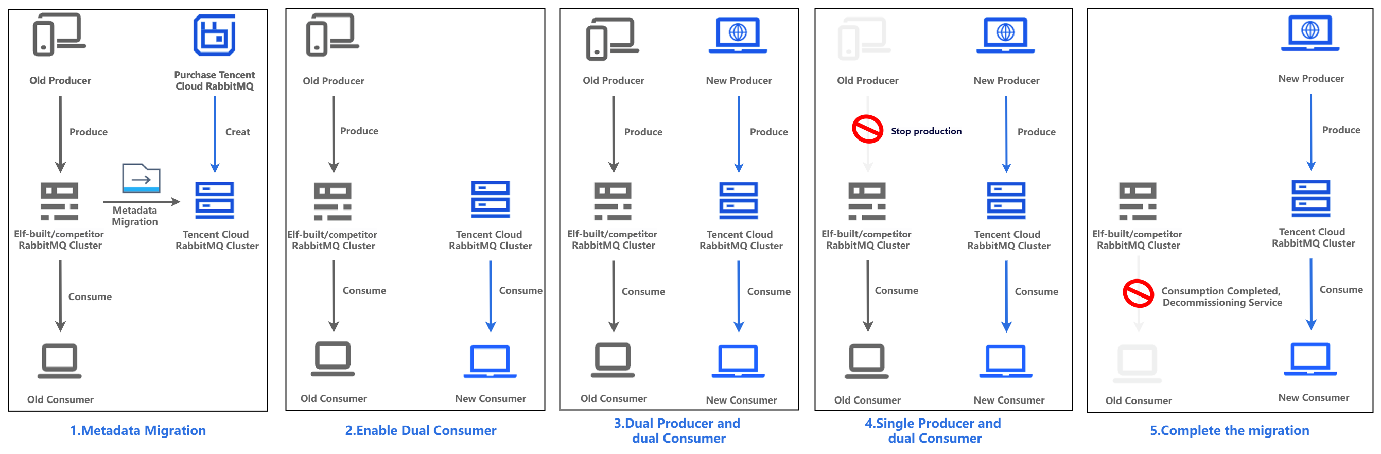 1.Migrate metadata. | 1. Purchase a TDMQ for RabbitMQ cluster. 2. Complete metadata migration. 3. Keep the existing cluster in read-write status. | Existing cluster: Read-Write New cluster: Ready |