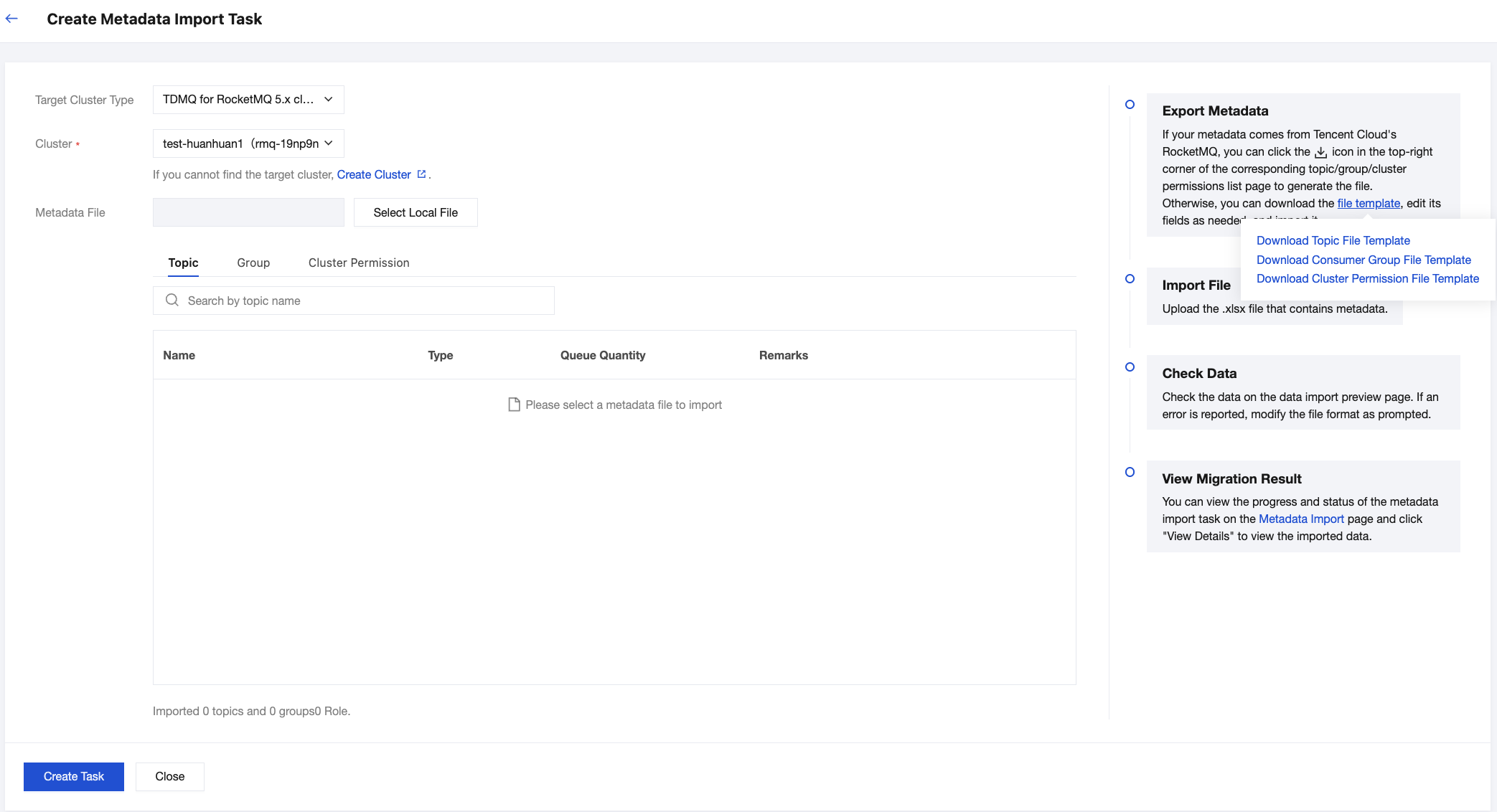 If your metadata originates from another TDMQ for RocketMQ cluster on Tencent Cloud, you can directly upload topic and group data by using a .xlsx template.