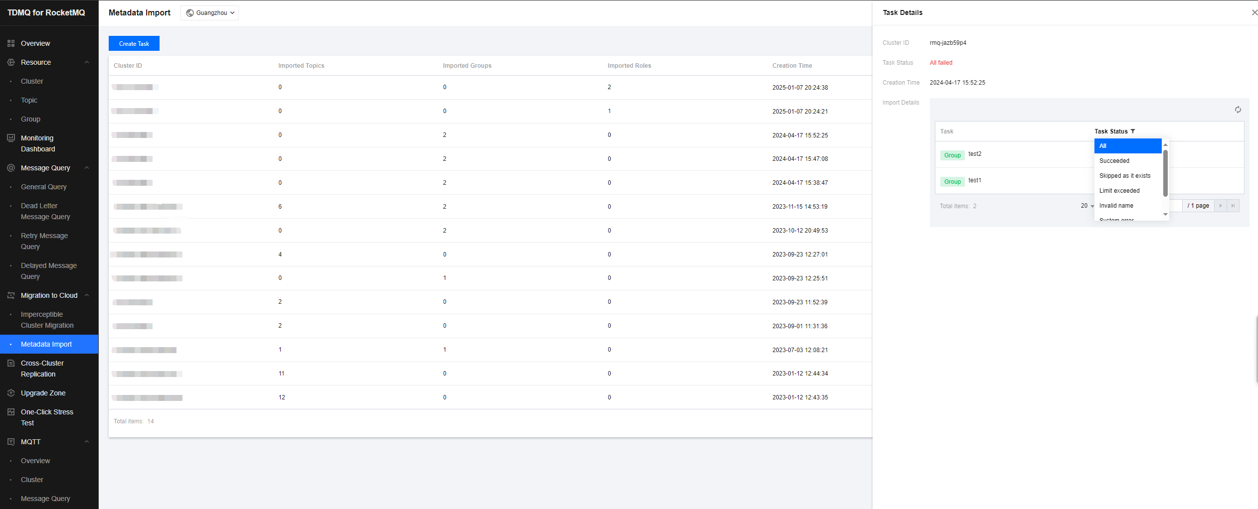 Import to cluster: Migrate metadata from the original self-built cluster to the created cluster. When performing a cluster migration task, the migration tool by default parses the part before the percent sign (%) in the topic name from the open-source RocketMQ dashboard as the namespace name, thereby creating multiple logically isolated namespaces for you. If namespaces were not differentiated in the original self-built cluster, the system will generate a default namespace named default for you (applicable only to 4.x exclusive clusters and existing 4.x virtual clusters).