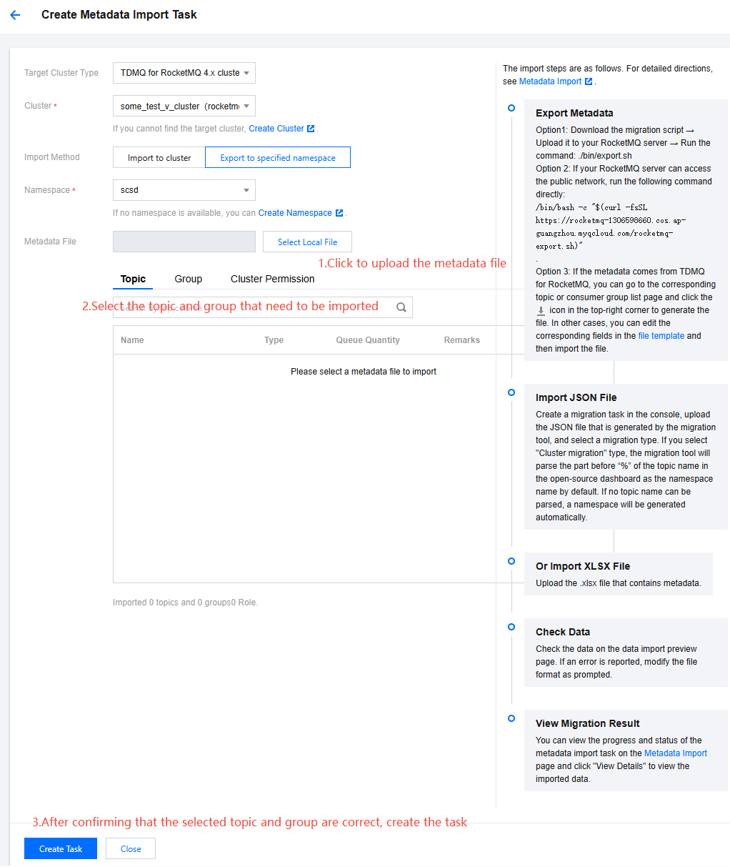 3. Upload the metadata file obtained in Step 1 according to the figure, and select the topics and groups to be imported.