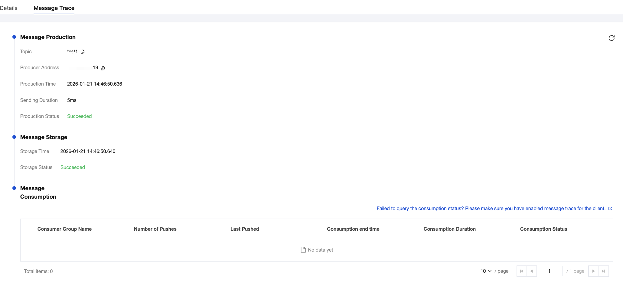 5. Click View Message Trace in the operation column, or click the Message Trace tab on the details page to view the message trace. For detailed description, see Message Trace and Description. Consumption Verification