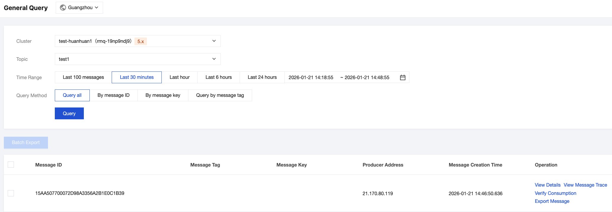 Query by message tag: This is a fuzzy query method suitable for scenarios where you have not recorded the message ID but have set a message tag. The query results display up to 64 messages. You can narrow down the query time range to pinpoint the desired messages.
