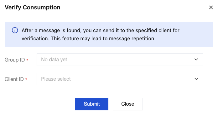 After a message is queried, you can click Verify Consumption in the operation column to send the message to the specified client to verify it. This feature may cause message duplication.