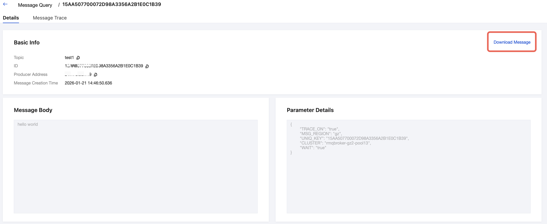To perform the following operations, you can use the message query feature in the TDMQ for RocketMQ console. You can view the content, parameters, and traces of a specific message by time dimension or by message ID, message key, or message tag found in the logs.