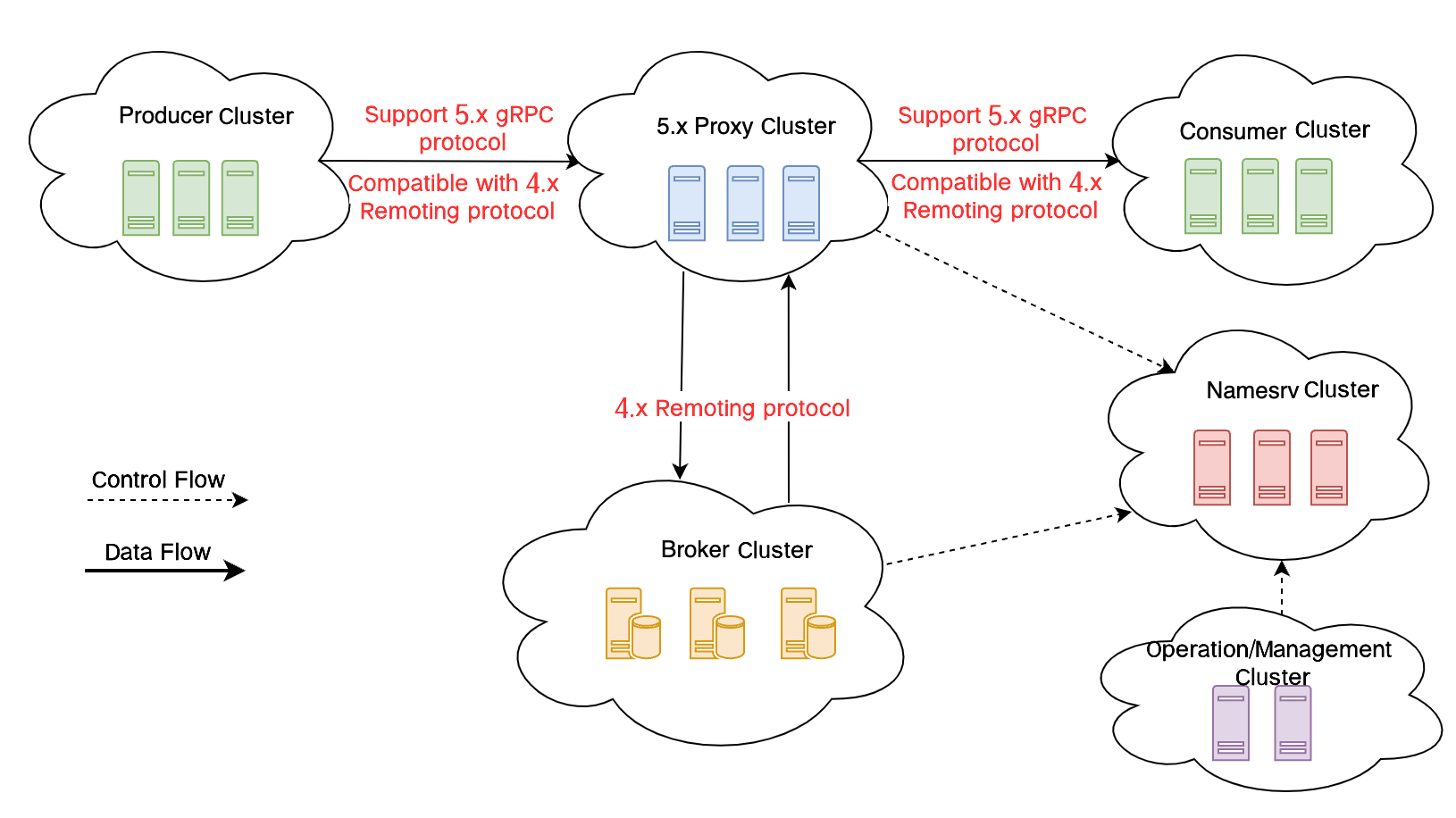 Proxy cluster: a new elastic, stateless proxy service that is deployed across AZs by default to ensure high availability. It splits the responsibilities of the 4.x broker, extracting computation logic such as client protocol adaptation, permission management, and consumption management.