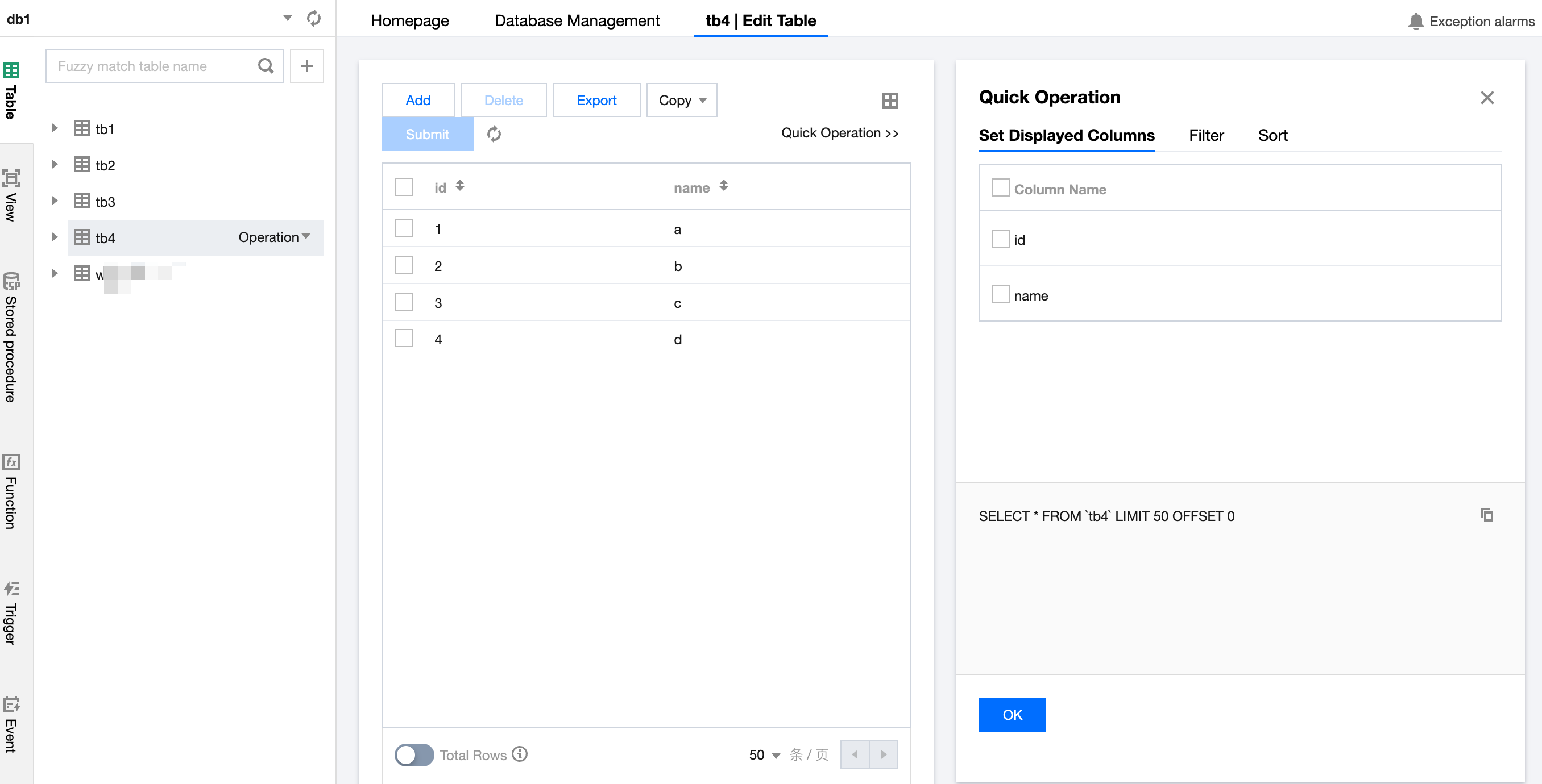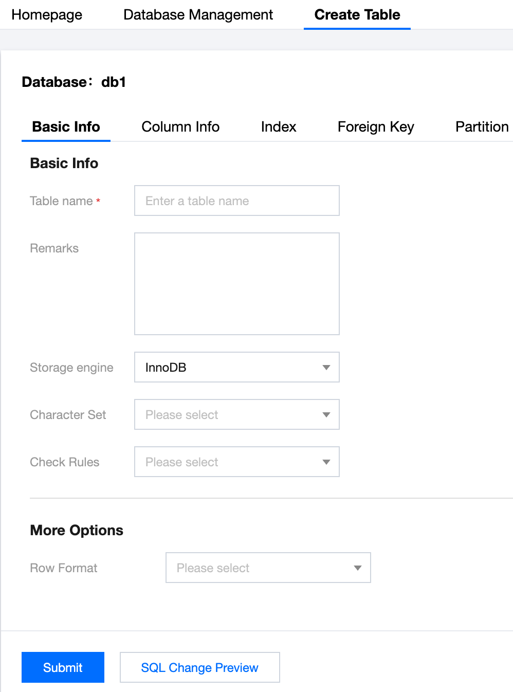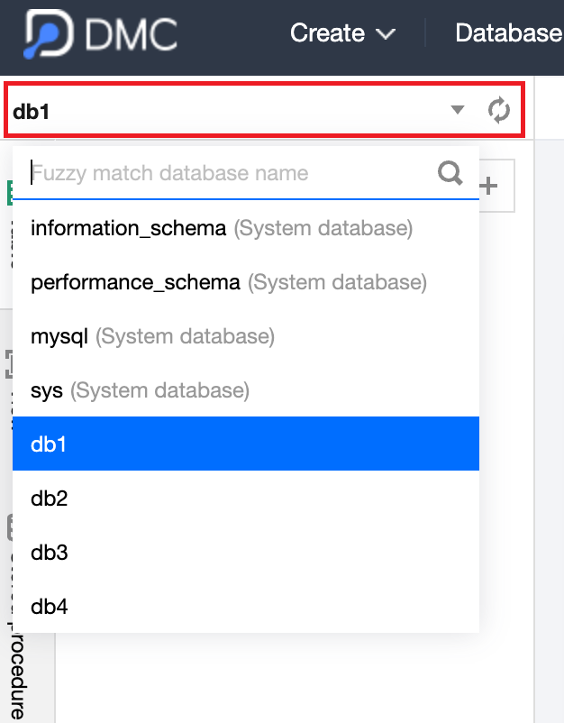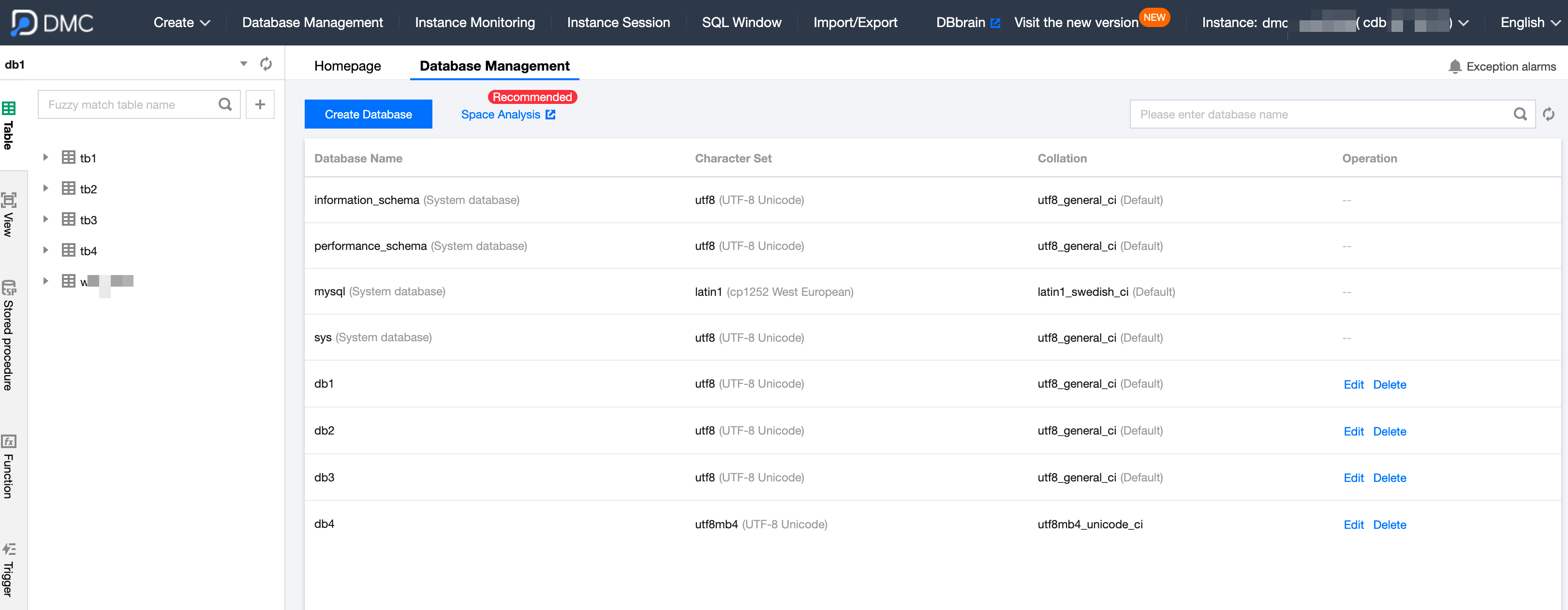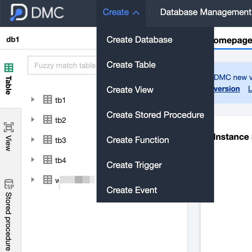 1. Log in to the DMC Console, and on the homepage, the following example uses a MySQL database for demonstration. 2. Create a database, table, view, stored procedure, function, trigger, or event.