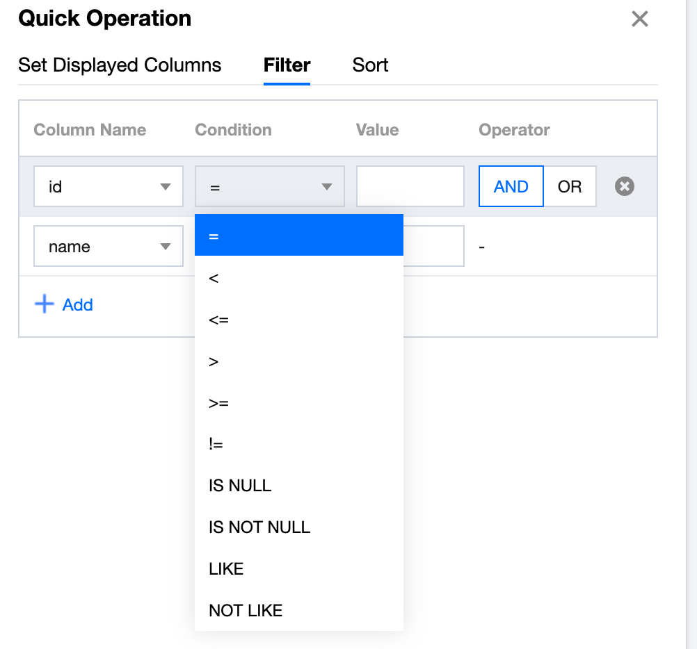 On the right side, quick operations are displayed, allowing you to filter and sort fields.