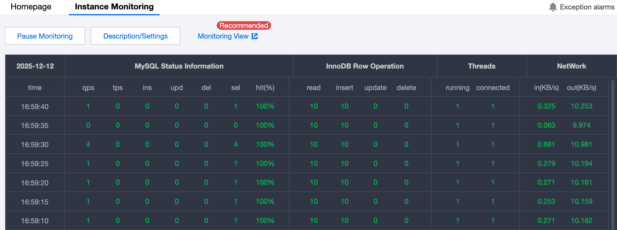 DMC provides multi-dimensional monitoring, including database status information, InnoDB storage engine row operations, database connections, and traffic, enabling users to stay informed about the performance status of database instances.